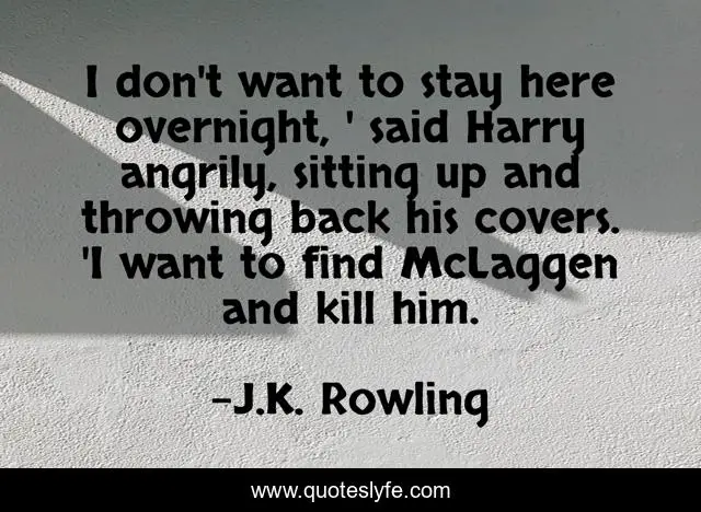 This page presents the quote "I don't want to stay here overnight, ' said Harry angrily, sitting up and throwing back his covers. 'I want to find McLaggen and kill him.". Author of this quote is J.K. Rowling. This quote is about humor, harry-potter, cormac-mclaggen,.