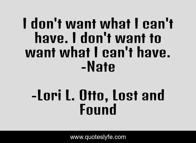 This page presents the quote "I don't want what I can't have. I don't want to want what I can't have. -Nate". Author of this quote is Lori L. Otto, Lost and Found. This quote is about love, emi, lori-l-otto, friendshipship, nate, affection,.