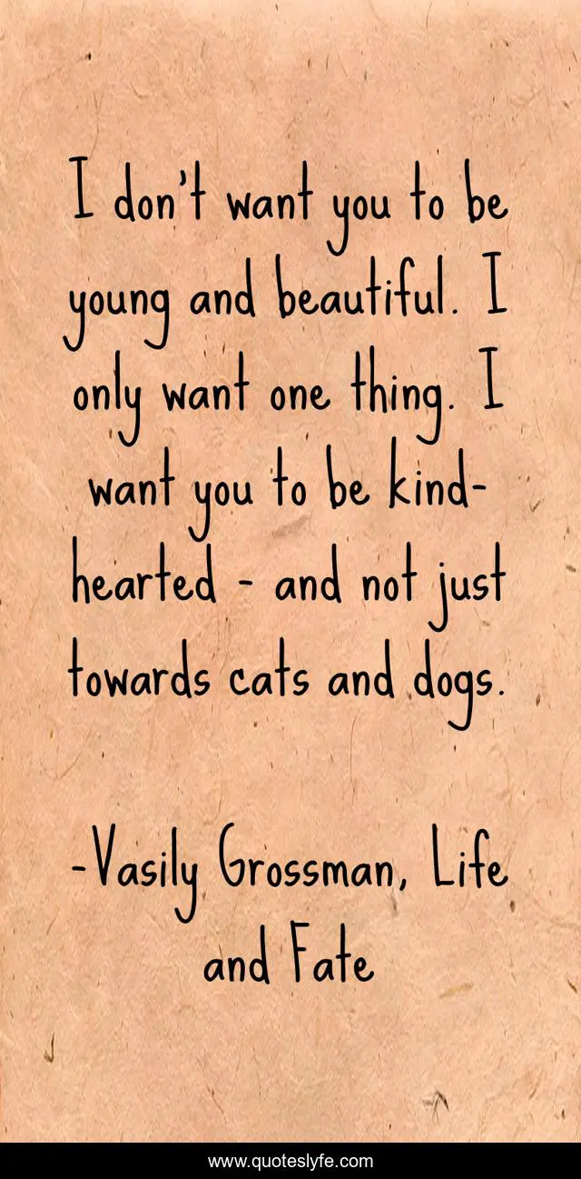 This page presents the quote "I don't want you to be young and beautiful. I only want one thing. I want you to be kind-hearted - and not just towards cats and dogs.". Author of this quote is Vasily Grossman, Life and Fate. This quote is about relationships, kindness, life-and-living, women,.