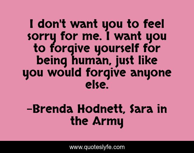 This page presents the quote "I don't want you to feel sorry for me. I want you to forgive yourself for being human, just like you would forgive anyone else.". Author of this quote is Brenda Hodnett, Sara in the Army. This quote is about enthusiasm, forgiveness, inspirational,.