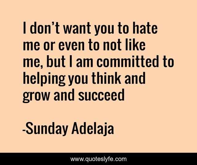 This page presents the quote "I don’t want you to hate me or even to not like me, but I am committed to helping you think and grow and succeed". Author of this quote is Sunday Adelaja. This quote is about life, love, help, commitment, calling, succeed, purpose, truth, grow,.