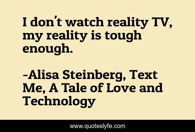This page presents the quote "I don't watch reality TV, my reality is tough enough.". Author of this quote is Alisa Steinberg, Text Me, A Tale of Love and Technology. This quote is about women-s-fiction, absurdist-fiction, humor, comic-fiction, fiction,.