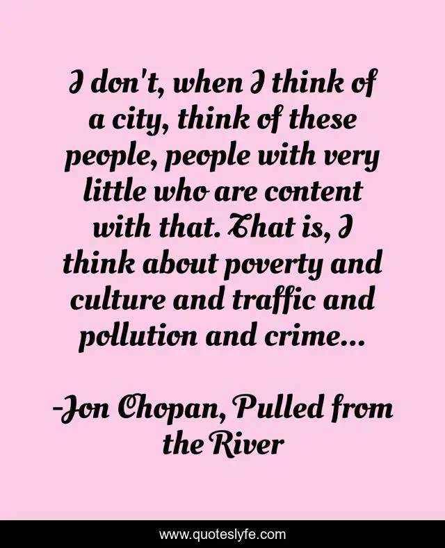This page presents the quote "I don't, when I think of a city, think of these people, people with very little who are content with that. That is, I think about poverty and culture and traffic and pollution and crime...". Author of this quote is Jon Chopan, Pulled from the River. This quote is about poverty, city-life, crime,.
