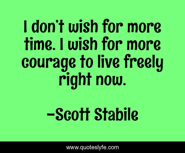 This page presents the quote "I don’t wish for more time. I wish for more courage to live freely right now.". Author of this quote is Scott Stabile. This quote is about life, love, motivation, courage, time, affection, inspiration,.