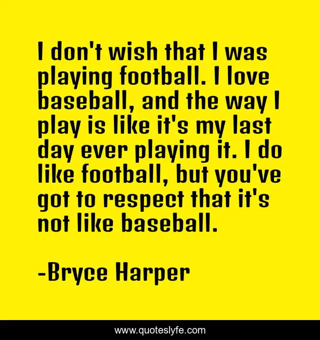 This page presents the quote "I don't wish that I was playing football. I love baseball, and the way I play is like it's my last day ever playing it. I do like football, but you've got to respect that it's not like baseball.". Author of this quote is Bryce Harper. This quote is about love, football, baseball, affection,.