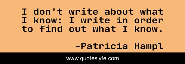 This page presents the quote "I don't write about what I know: I write in order to find out what I know.". Author of this quote is Patricia Hampl. This quote is about imagination, memory, knowledge, writing,.