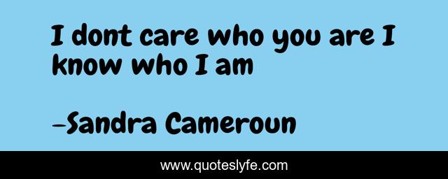 This page presents the quote "I dont care who you are I know who I am". Author of this quote is Sandra Cameroun. This quote is about inspirational-attitude, enthusiasm, self-esteem, inspirational, self-help,.