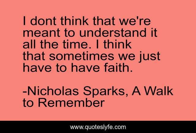 This page presents the quote "I dont think that we're meant to understand it all the time. I think that sometimes we just have to have faith.". Author of this quote is Nicholas Sparks, A Walk to Remember. This quote is about faith, understand,.