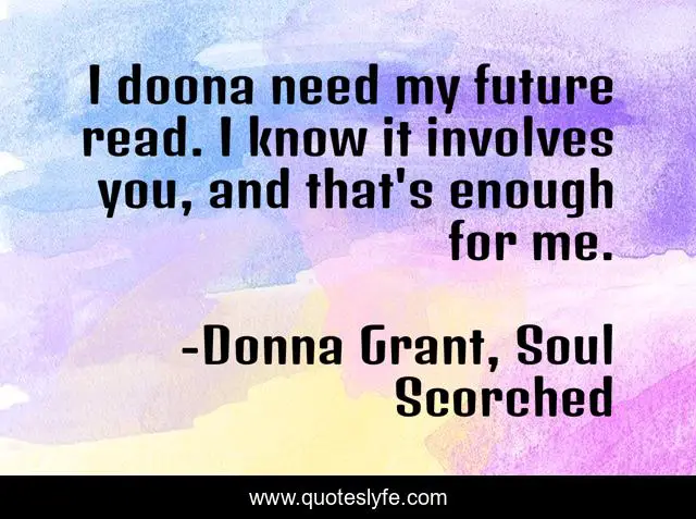This page presents the quote "I doona need my future read. I know it involves you, and that's enough for me.". Author of this quote is Donna Grant, Soul Scorched. This quote is about dreagan, dragon-kings, dragons, druids, fae,.