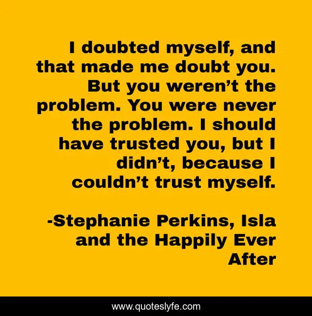 This page presents the quote "I doubted myself, and that made me doubt you. But you weren’t the problem. You were never the problem. I should have trusted you, but I didn’t, because I couldn’t trust myself.". Author of this quote is Stephanie Perkins, Isla and the Happily Ever After. This quote is about doubt, isla-and-the-happily-ever-after, trust, stephanie-perkins,.