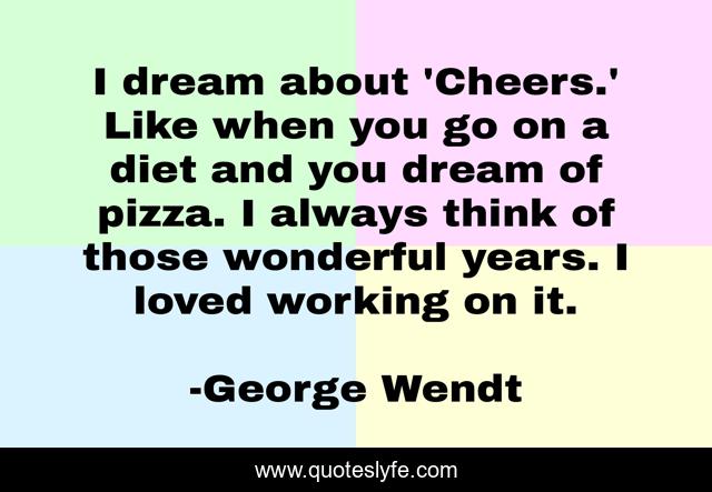 This page presents the quote "I dream about 'Cheers.' Like when you go on a diet and you dream of pizza. I always think of those wonderful years. I loved working on it.". Author of this quote is George Wendt. This quote is about dream, think, pizza,.