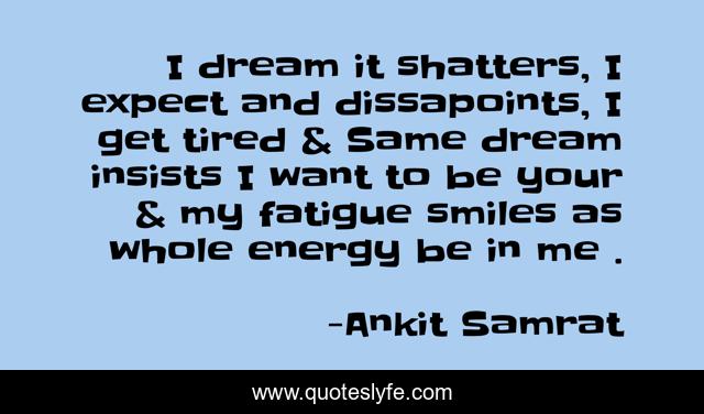 This page presents the quote "I dream it shatters, I expect and dissapoints, I get tired & Same dream insists I want to be your & my fatigue smiles as whole energy be in me .". Author of this quote is Ankit Samrat. This quote is about work, inspiration,.