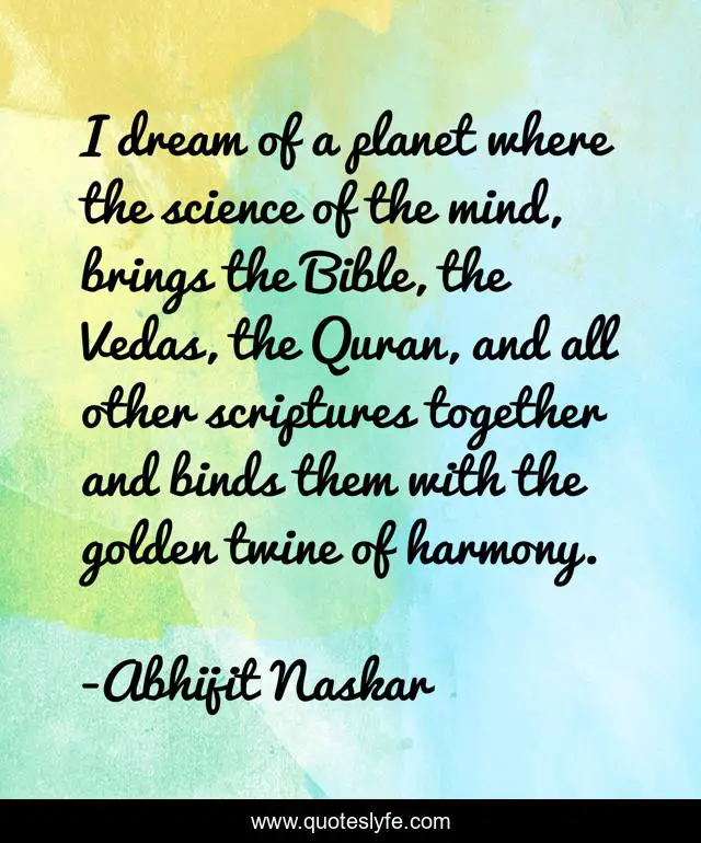 I dream of a planet where the science of the mind, brings the Bible, the Vedas, the Quran, and all other scriptures together and binds them with the golden twine of harmony.