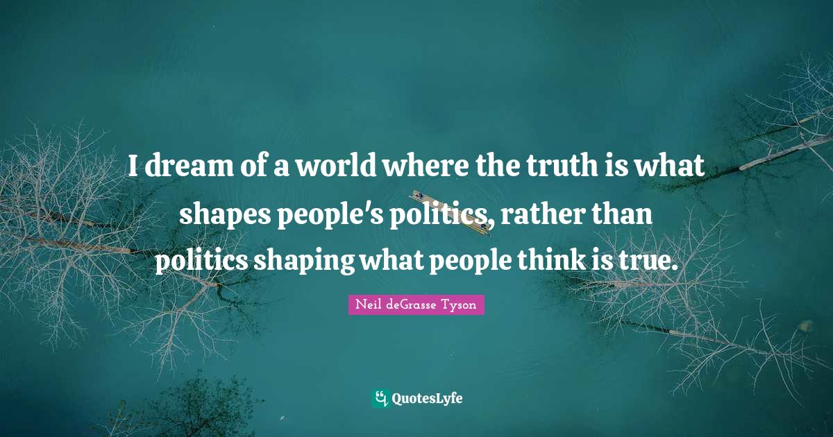 This page presents the quote "I dream of a world where the truth is what shapes people's politics, rather than politics shaping what people think is true.". Author of this quote is Neil deGrasse Tyson. This quote is about truth is, people, shapes, politics, dream, truth, thinking, world,.
