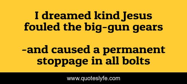 This page presents the quote "I dreamed kind Jesus fouled the big-gun gears". Author of this quote is and caused a permanent stoppage in all bolts. .