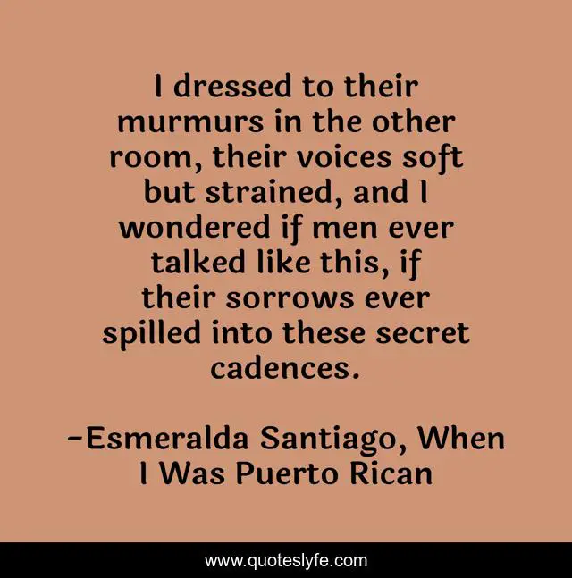 This page presents the quote "I dressed to their murmurs in the other room, their voices soft but strained, and I wondered if men ever talked like this, if their sorrows ever spilled into these secret cadences.". Author of this quote is Esmeralda Santiago, When I Was Puerto Rican. This quote is about men-and-women, sorrow, men, quiet, pain, women,.