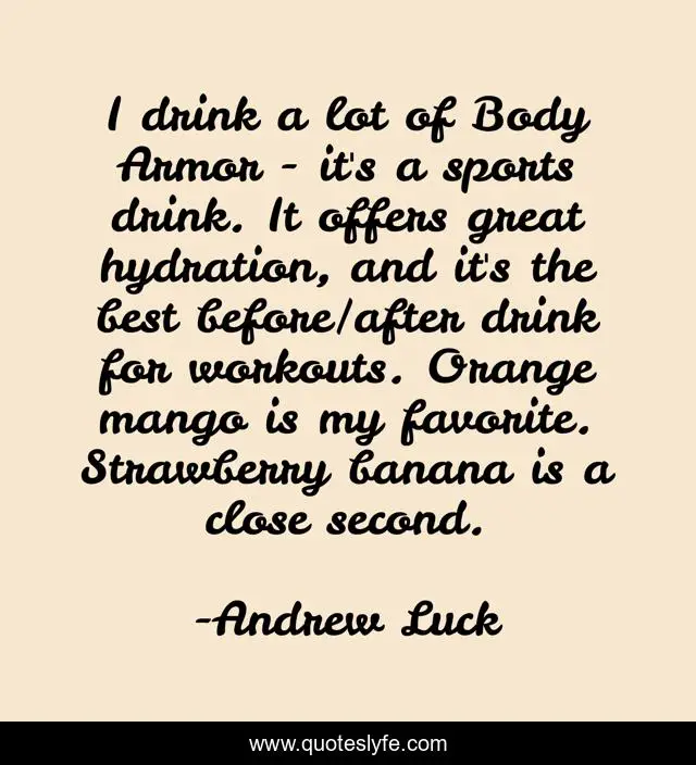 This page presents the quote "I drink a lot of Body Armor - it's a sports drink. It offers great hydration, and it's the best before/after drink for workouts. Orange mango is my favorite. Strawberry banana is a close second.". Author of this quote is Andrew Luck. This quote is about body, great, best,.