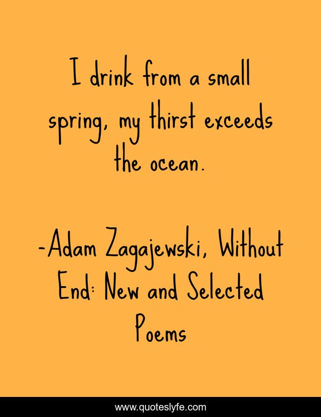 This page presents the quote "I drink from a small spring, my thirst exceeds the ocean.". Author of this quote is Adam Zagajewski, Without End: New and Selected Poems. .