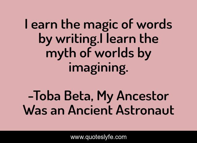 This page presents the quote "I earn the magic of words by writing.I learn the myth of worlds by imagining.". Author of this quote is Toba Beta, My Ancestor Was an Ancient Astronaut. This quote is about imagining, magic, myth, writing,.