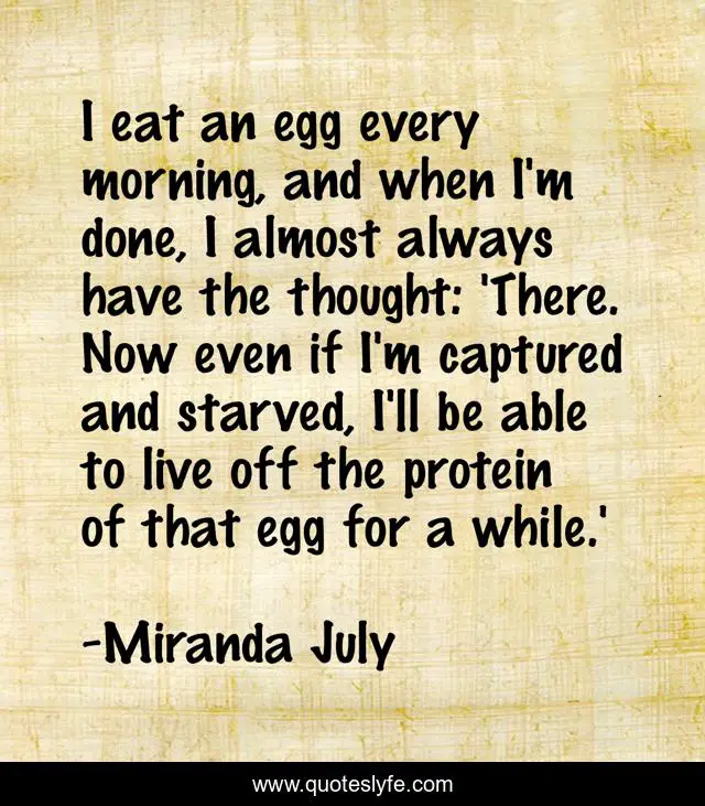 This page presents the quote "I eat an egg every morning, and when I'm done, I almost always have the thought: 'There. Now even if I'm captured and starved, I'll be able to live off the protein of that egg for a while.'". Author of this quote is Miranda July. This quote is about thought, live, egg,.