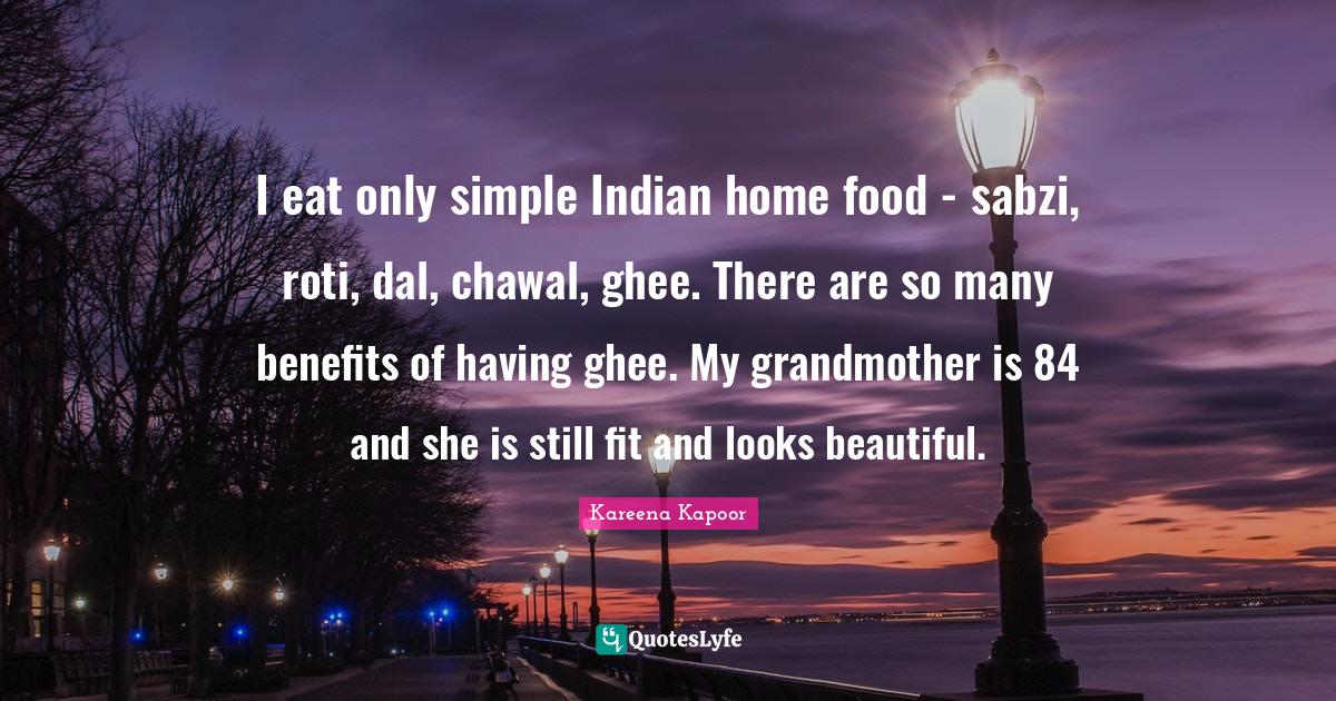 This page presents the quote "I eat only simple Indian home food - sabzi, roti, dal, chawal, ghee. There are so many benefits of having ghee. My grandmother is 84 and she is still fit and looks beautiful.". Author of this quote is Kareena Kapoor. This quote is about food, indian, benefits, fit, looks, beautiful, grandmother, my grandmother, simple,.