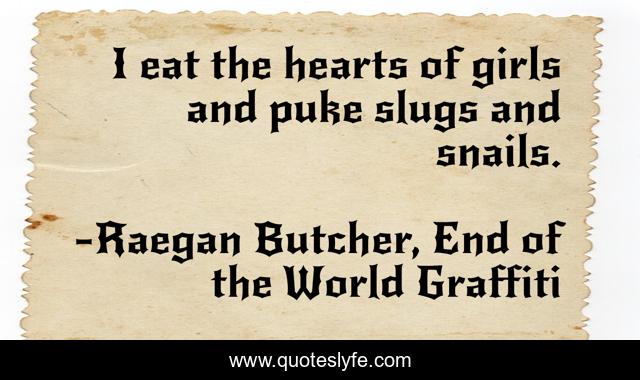 This page presents the quote "I eat the hearts of girls and puke slugs and snails.". Author of this quote is Raegan Butcher, End of the World Graffiti. .
