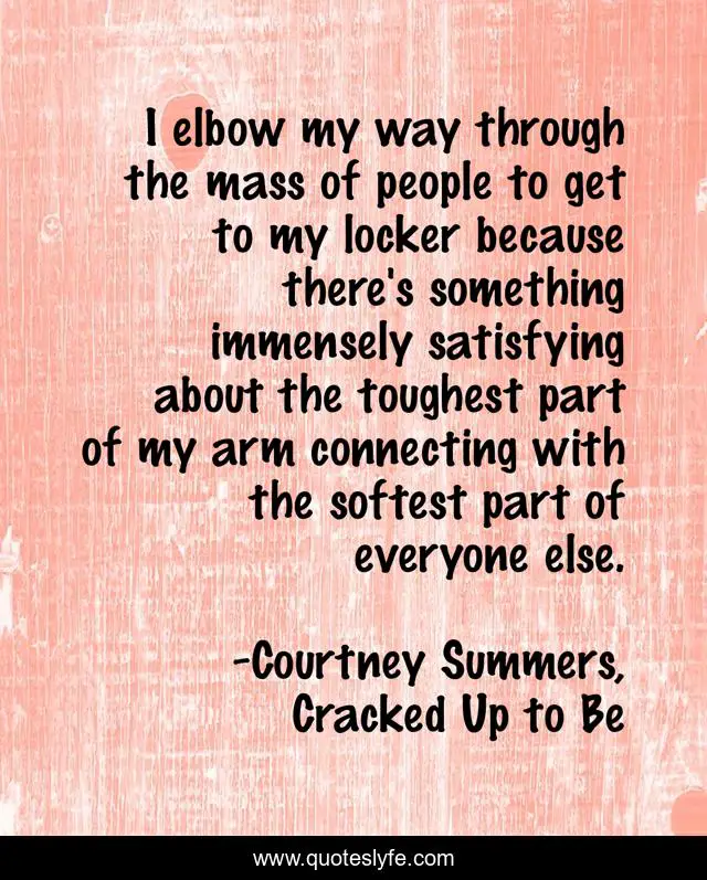 This page presents the quote "I elbow my way through the mass of people to get to my locker because there's something immensely satisfying about the toughest part of my arm connecting with the softest part of everyone else.". Author of this quote is Courtney Summers, Cracked Up to Be. .