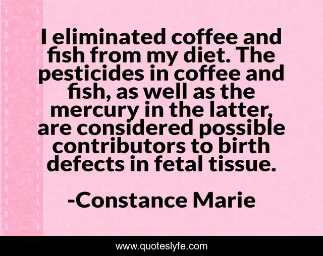 This page presents the quote "I eliminated coffee and fish from my diet. The pesticides in coffee and fish, as well as the mercury in the latter, are considered possible contributors to birth defects in fetal tissue.". Author of this quote is Constance Marie. This quote is about coffee, fish, birth,.