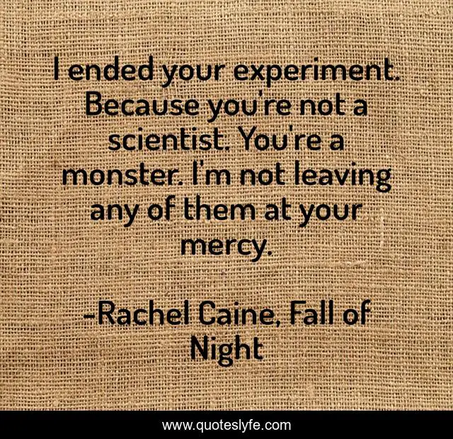 This page presents the quote "I ended your experiment. Because you're not a scientist. You're a monster. I'm not leaving any of them at your mercy.". Author of this quote is Rachel Caine, Fall of Night. This quote is about morganville-vampires, science, claire-danvers, unethical, experimentation,.