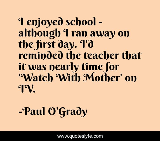 This page presents the quote "I enjoyed school - although I ran away on the first day. I'd reminded the teacher that it was nearly time for 'Watch With Mother' on TV.". Author of this quote is Paul O'Grady. This quote is about school, time, mother,.