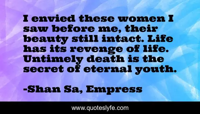 This page presents the quote "I envied these women I saw before me, their beauty still intact. Life has its revenge of life. Untimely death is the secret of eternal youth.". Author of this quote is Shan Sa, Empress. This quote is about immortality, eternal-youth, bitterness,.