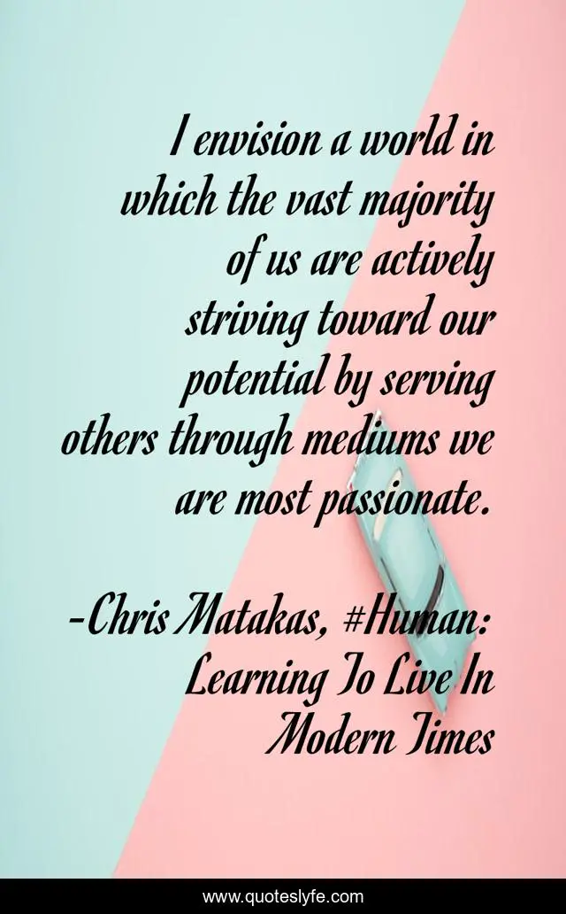 This page presents the quote "I envision a world in which the vast majority of us are actively striving toward our potential by serving others through mediums we are most passionate.". Author of this quote is Chris Matakas, #Human: Learning To Live In Modern Times. This quote is about world, purpose, vision, mission-statement,.