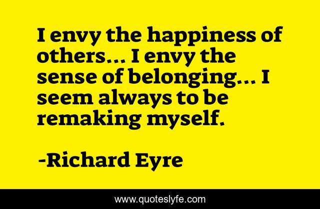This page presents the quote "I envy the happiness of others... I envy the sense of belonging... I seem always to be remaking myself.". Author of this quote is Richard Eyre. This quote is about myself, belonging, envy,.
