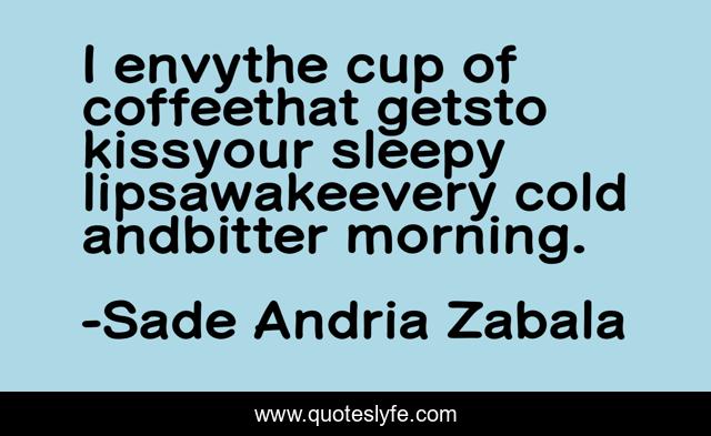 This page presents the quote "I envythe cup of coffeethat getsto kissyour sleepy lipsawakeevery cold andbitter morning.". Author of this quote is Sade Andria Zabala. This quote is about coffee, heartbreak, love, poetry, affection,.