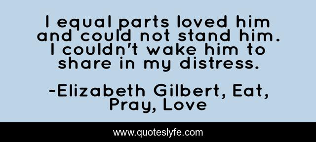 This page presents the quote "I equal parts loved him and could not stand him. I couldn't wake him to share in my distress.". Author of this quote is Elizabeth Gilbert, Eat, Pray, Love. This quote is about pray, love, eat, affection, elizabeth-gilbert,.
