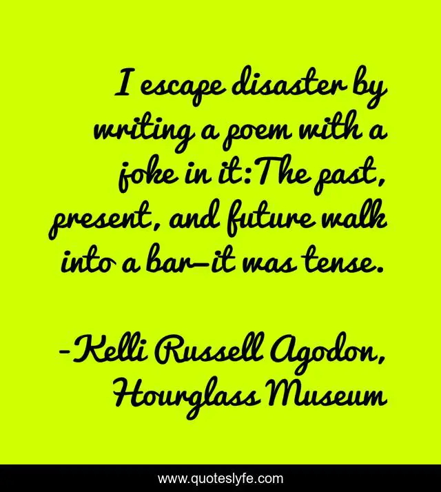 This page presents the quote "I escape disaster by writing a poem with a joke in it:The past, present, and future walk into a bar—it was tense.". Author of this quote is Kelli Russell Agodon, Hourglass Museum. This quote is about poem, humor, disaster, writer, poetry, syntax, english-major, grammar, writing,.