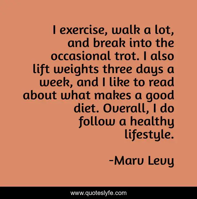 This page presents the quote "I exercise, walk a lot, and break into the occasional trot. I also lift weights three days a week, and I like to read about what makes a good diet. Overall, I do follow a healthy lifestyle.". Author of this quote is Marv Levy. This quote is about healthy, good, walk,.