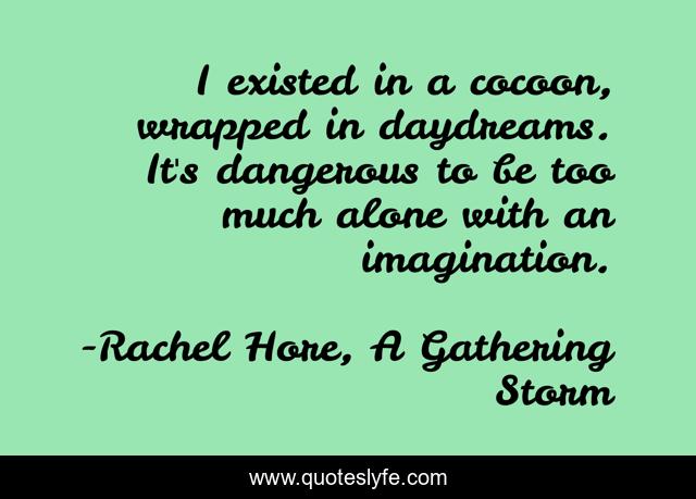 This page presents the quote "I existed in a cocoon, wrapped in daydreams. It's dangerous to be too much alone with an imagination.". Author of this quote is Rachel, A Gathering Storm. This quote is about danger, imagination, daydreams, dangerous,.