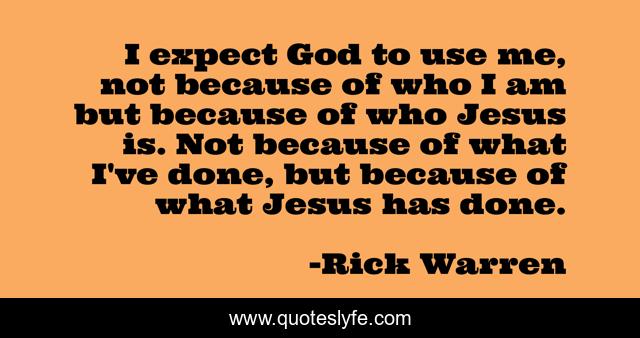 This page presents the quote "I expect God to use me, not because of who I am but because of who Jesus is. Not because of what I've done, but because of what Jesus has done.". Author of this quote is Rick Warren. .