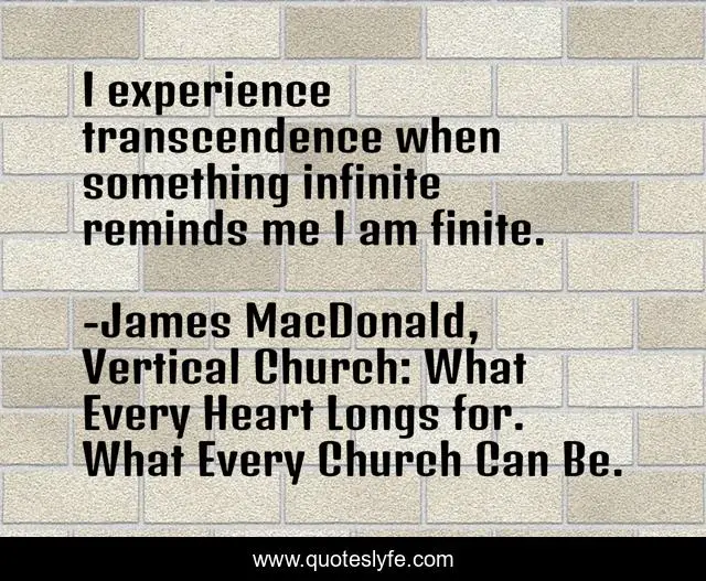 This page presents the quote "I experience transcendence when something infinite reminds me I am finite.". Author of this quote is James MacDonald, Vertical Church: What Every Heart Longs for. What Every Church Can Be.. This quote is about eternity, transcendence,.