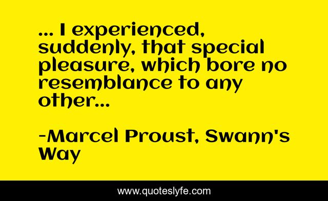 This page presents the quote "... I experienced, suddenly, that special pleasure, which bore no resemblance to any other...". Author of this quote is Marcel Proust, Swann's Way. .