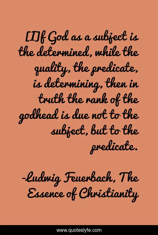 This page presents the quote "[I]f God as a subject is the determined, while the quality, the predicate, is determining, then in truth the rank of the godhead is due not to the subject, but to the predicate.". Author of this quote is Ludwig Feuerbach, The Essence of Christianity. .