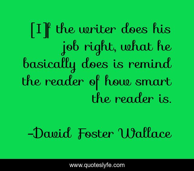 This page presents the quote "[I]f the writer does his job right, what he basically does is remind the reader of how smart the reader is.". Author of this quote is David Foster Wallace. This quote is about enthusiasm, writers, inspirational, readers,.