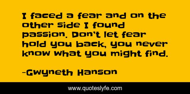 This page presents the quote "I faced a fear and on the other side I found passion. Don’t let fear hold you back, you never know what you might find.". Author of this quote is Gwyneth Hanson. This quote is about passion, fear, barriers-in-life, seek, find,.