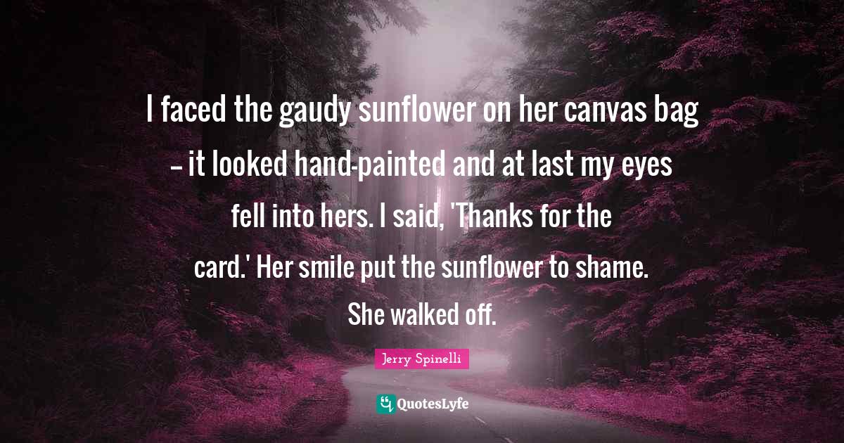 This page presents the quote "I faced the gaudy sunflower on her canvas bag -- it looked hand-painted and at last my eyes fell into hers. I said, 'Thanks for the card.' Her smile put the sunflower to shame. She walked off.". Author of this quote is Jerry Spinelli. This quote is about sunflower, canvas, thanks, eye, said, hands, gaudy, her smile, shame,.