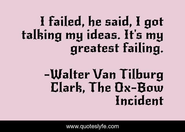 This page presents the quote "I failed, he said, I got talking my ideas. It's my greatest failing.". Author of this quote is Walter Van Tilburg Clark, The Ox-Bow Incident. This quote is about talking, failing, ideas,.