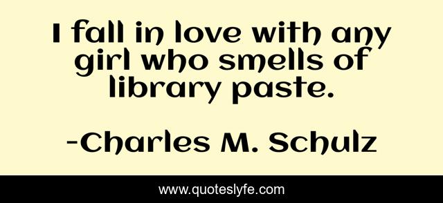 This page presents the quote "I fall in love with any girl who smells of library paste.". Author of this quote is Charles M. Schulz. This quote is about charlie-brown, libraries, love, affection,.