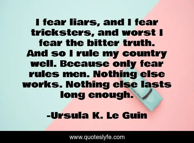 This page presents the quote "I fear liars, and I fear tricksters, and worst I fear the bitter truth. And so I rule my country well. Because only fear rules men. Nothing else works. Nothing else lasts long enough.". Author of this quote is Ursula K. Le Guin. This quote is about fear, ruling, power,.