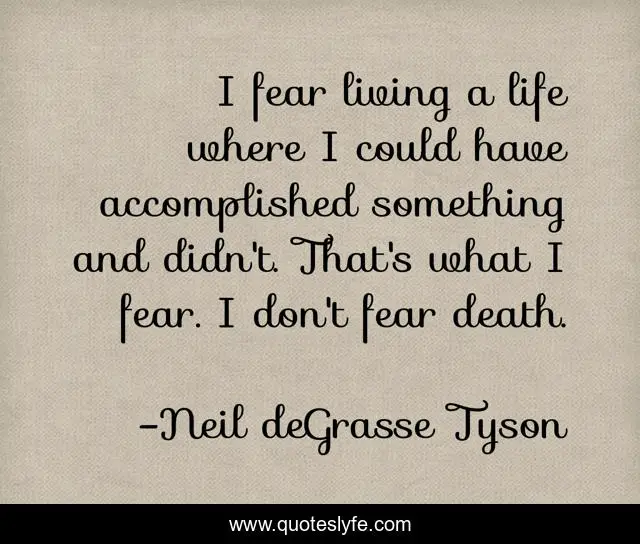 This page presents the quote "I fear living a life where I could have accomplished something and didn't. That's what I fear. I don't fear death.". Author of this quote is Neil deGrasse Tyson. This quote is about life, death, accomplishments, goals, worries, fear,.