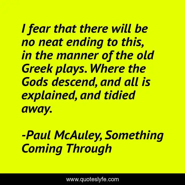 This page presents the quote "I fear that there will be no neat ending to this, in the manner of the old Greek plays. Where the Gods descend, and all is explained, and tidied away.". Author of this quote is Paul McAuley, Something Coming Through. This quote is about gods, ending, plays, greek,.
